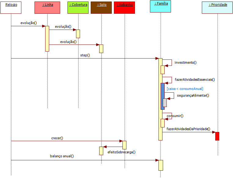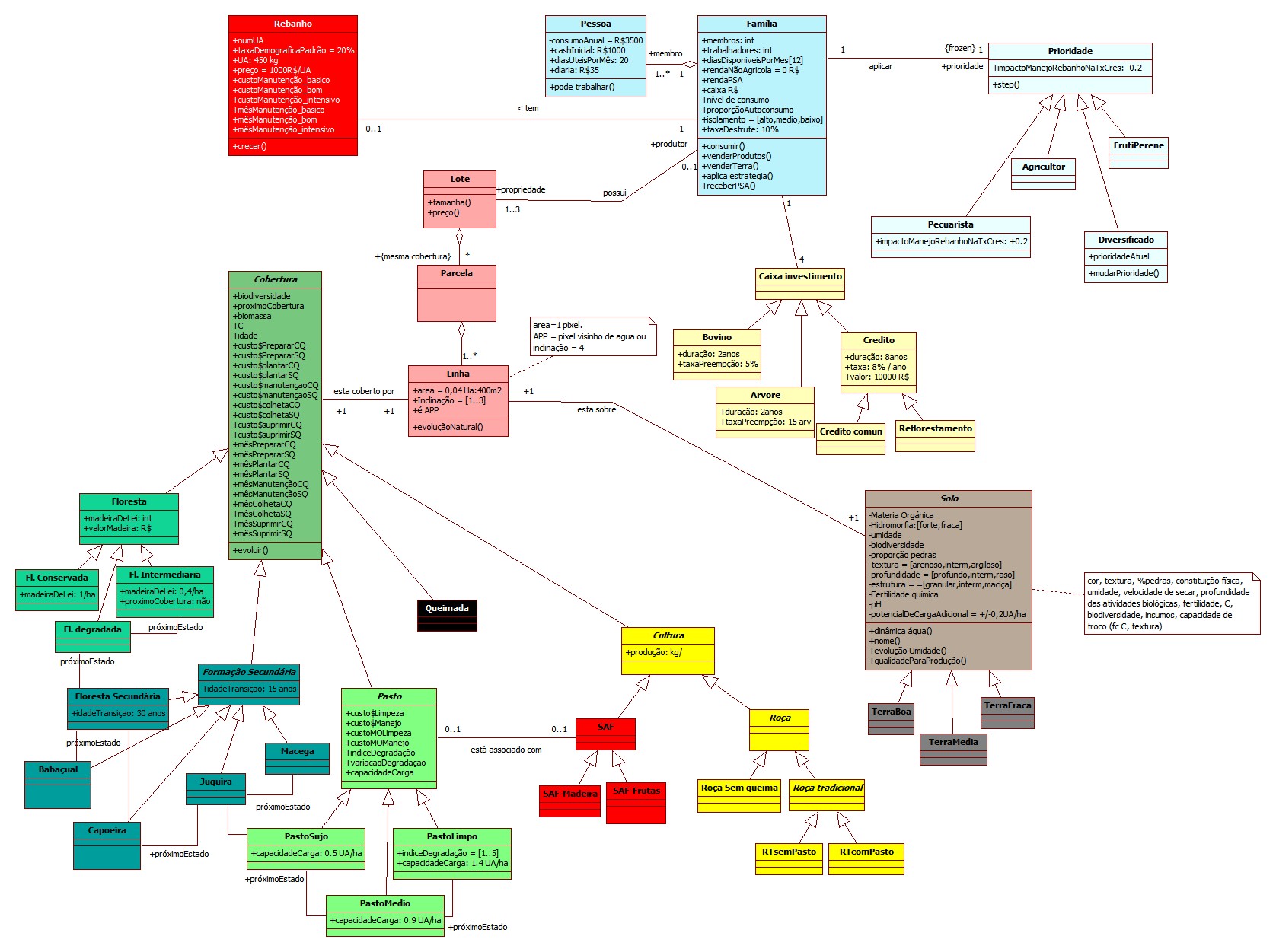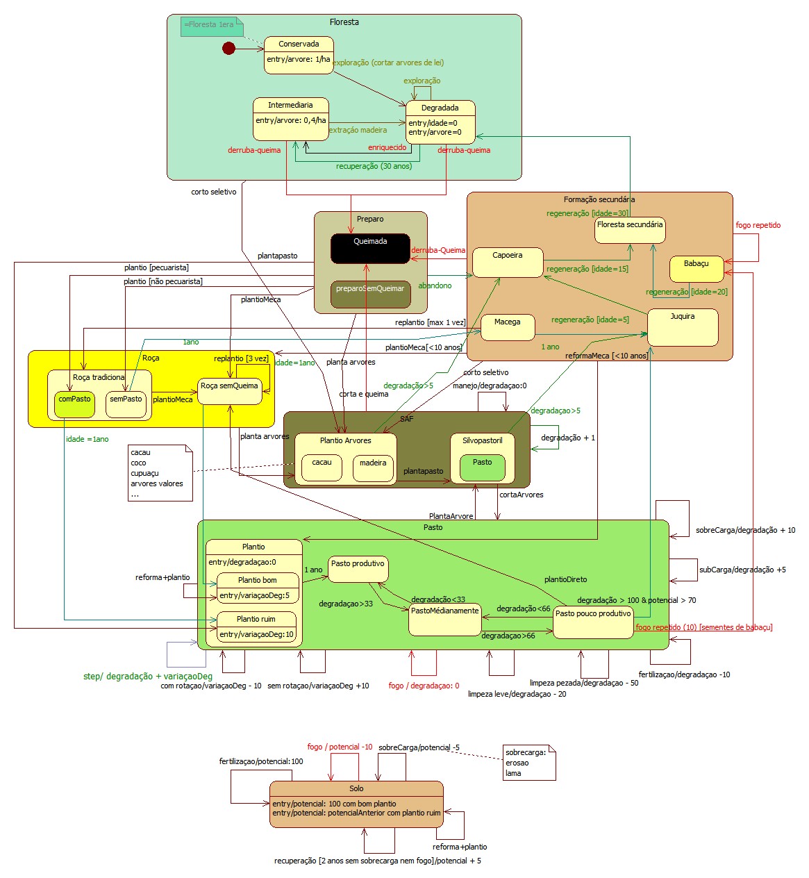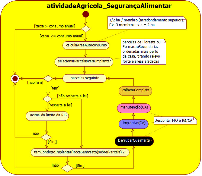 The herd is distributed on the pastures with a mean value of one livestock unit per hectare (for the basic version without intensification). Each cover has technical and economical attributes, its own dynamics, several requirements linked to its manpower needs and farm inputs, and a production value. Each season, it generates a production, which is immediately converted into cash at harvest time. But without maintenance, productivity decreases until disappearing. An agent (a family of N members) has two main features: his labor-force and his money. He uses his family labor to achieve the agriculture works on the farm or to sell it as external manpower. This labor-force corresponds to an amount of available working days that decreases with the performed tasks. This quantity is reset to its maximum at the beginning of the year. If he receives money at the harvest time, he spends a part of it for the family consumption, for all farming operating costs including the purchase of cows and for temporary labor employment. A family is associated with a strategy that consists in performing farm activities oriented towards agricultural preferences. The strategies of the model are Breeder, perennial Planter, Grower and Diversified. For example, by choosing to be Grower or Breeder, a family cultivates his land favoring his specialty. But this choice does not necessarily mean to neglect the other crops already present on the farm. Each year, the agent starts by performing its essential activities; afterward he does the activities related to its priority. Thus, even if his strategy is Planter, an agent begins cultivate a few parcels of annual crops for his food security and performs its basic rancher tasks (minimum management of the herd and the pastures). The rest of his labor force is then dedicated to his perennial crops. Main class diagram (click to enlarge) DynamicsScheduling Sequence diagram (click to enlarge) The following state-transition diagram shows all the different covers that are designed in the model and the different ways they evolve and change, through transitions. The red transitions correspond to human activities (cutting, planting...). State Transition diagram of land cover (click to enlarge) Scenario 0: The following activity diagram presents the organization of Scenario 0. (click on sub-activities to get a focus on them)