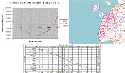To be able to build the simulation model a two-part fieldwork in the study area was conducted by a research team to familiarize themselves with the people’s perception of their current NRM situation and its problems. The fieldwork allowed the researchers to gather spatial information on the study area, and details about activities of the locals with regards to the use of their natural resources were gathered through workshops, interviews and group discussions. A satellite image (2000 Landsat Image) was also used to get the land use/cover information of the study area. All these information were processed and integrated in the MAS simulation model. The model included two main stakeholders, namely the inhabitants and the local government unit (LGU). 3 types of inhabitants were considered for the model: (1) slash-and-burn farmers; (2) subsistence fishermen; and (3) fishpond workers. The slash-and-burn farmers would turn forest areas to farm lands then abandon them after several cultivation cycles. The fishermen would fish only on shallow areas, but they may also perform fishing activities in mangrove areas, wherein no human activity is permitted as they were all declared as sanctuaries by the LGU. The slash-and-burn farmers and fishermen also go to the forest to gather firewood and quarry limestone to augment their insufficient income. The fishpond workers would put poison in their ponds after harvest, which eventually drain to the sea. Another activity of the fishpond workers is to replace the bottom of the pond after four harvests. To do this, they would have to quarry for limestone on mountainsides. The old bottom from the fishpond would then be used to repair the dumped on sides of roads. The LGU on the other hand is tasked reforest the mangrove areas and declare them as sanctuaries. Eight scenarios were set-up based on the combinations of the actions to be taken by the fishermen and the LGU. On each scenario, all the fishermen could either be following the law on sanctuaries (i.e. no human activity in the mangrove areas are performed), breaking the law, or each of them could be randomly breaking the law. Also, the fishermen would ask the LGU to give limited access to the sanctuaries. The LGU could perform the following tasks depending on the scenario: (1) don’t perform any mangrove reforestation activity and ignore the requests of the fishermen; (2) perform mangrove reforestation, but ignore the requests of the fishermen; or (3) perform mangrove reforestation and give limited access to the sanctuaries. The results of the scenarios were analyzed using charts, change-detection maps and cross tabulations of land use/cover change.