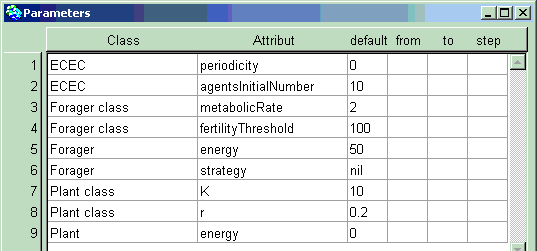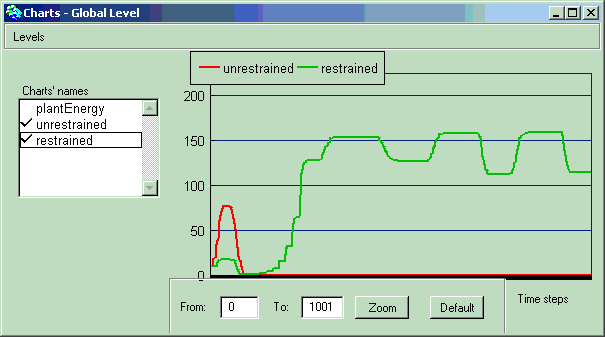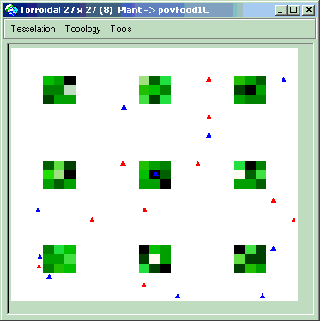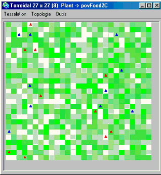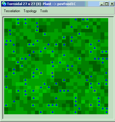Foragers are of two types that differes in their feeding behavior. When restrained foragers eat, they take only 50% of the plants energy. In contrast, unrestrained foragers eat 99% of the plant. This parameter is less than 100% so that plants can continue to grow after being fed on, rather than being permanently destroyed. Rules for Foragers MovementsForagers examine their current and eight adjacent cells, and from those not occupied by another forager, choose the cell containing the plant with the most energy (with ties broken randomly). If the chosen cell would yield enough food to meet their metabolic cost for one time step they move there. (This fixed metabolic cost per time step is the same for all foragers.) If not, they move instead to a randomly chosen adjacent cell not occupied by another forager. This movement rule leads to the emigration of foragers from depleted patches, and simulates the behavior of individuals exploiting local food sources while they last, but migrating rather than starving in an inadequate food patch. Other Biological Functions of ForagersForagers also loose energy each time step as a fixed metabolic cost, regardless of whether or not they move. If their energy store reachs zero they die, but they do not have maximum life spans. If a foragers energy level reachs an upper fertility threshold it reproduces asexually, creating an offspring with the same heritable traits as itself (e.g., feeding strategy). At the same time the parents energy store is reduced by the offsprings initial energy. Newborn offspring occupy the cell nearest to their parent that is not already occupied by a forager.