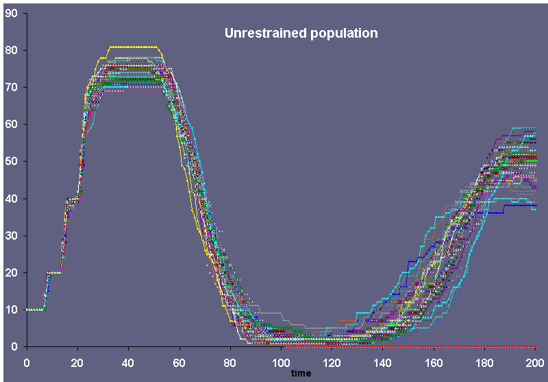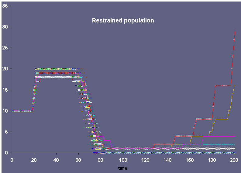 This analysis shows that "unrestrained" populations of foragers survive with some fluctuations according to the capacity of the environment, while the "retrained" populations colapse. But, in some cases, the "restrained" population may survive. With the Cormas analysis module, it is now possible to record the value of the random seed (Sim22 (seed=3230785234493) = the red curves), and to run a new simulation with this value to observe and analyse this specific simulation. This can be done by adding a line in the "init" method of the model :