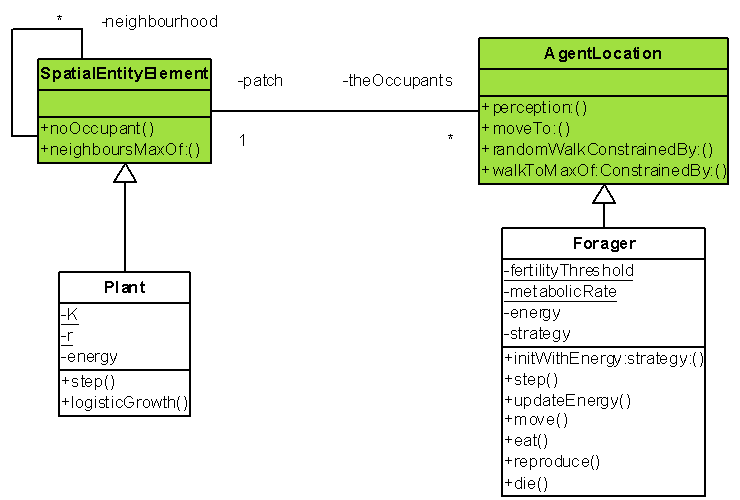 The model consists of a two dimensional grid, wrapped in both axes to avoid edge effects, containing two kinds of agents: plants and foragers. The main idea is the study of the survival of two populations of agents that depends on the spatial configuration.