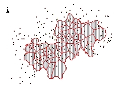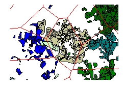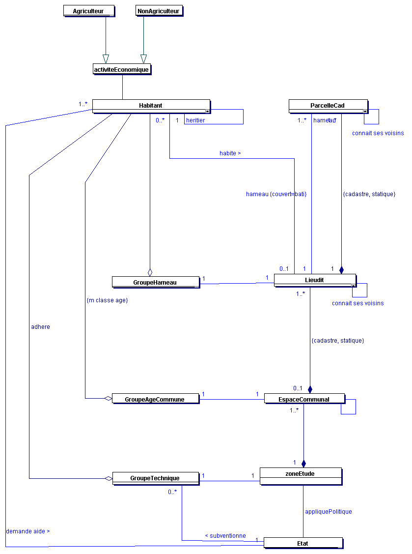 Les dynamiques et leurs interactionsLa végétation évolue sous l’influence de plusieurs processus : la croissance naturelle de la végétation, et sa diffusion à travers le paysage (processus de percolation), les prélèvements de biomasse effectués d’une part par les troupeaux, et d’autre part pour les besoins domestiques de chauffage et de construction, les plantations forestières, et les défriches. Quand la biomasse augmente sur une parcelle, sa partie ligneuse augmente aussi, interdisant ainsi progressivement le pâturage. La croissance de la biomasse peut être décomposée en croissance sur place et croissance provenant de la diffusion. A partir d’une distribution spatiale initiale dans les lieux-dits, nous avons fait l’hypothèse que la population pouvait être décomposée en une partie pérenne et une partie non pérenne, qui disparaît progressivement quand les individus arrivent à un âge donné. La population consomme du bois pour ses propres besoins, et de la biomasse pour les besoins des troupeaux. La typologie des élevages élaborée par les agronomes de l’équipe nous a permis d’affecter à chaque éleveur un coefficient d’impact sur la végétation. La dynamique de la population implique des mécanismes d’adaptation et de réallocation des ressources. Nous avons utilisé pour ça un « marché des moutons » qui réalloue à chaque étape les animaux selon l’équilibre besoins/disponibilités de chaque éleveur ; et un processus de réallocation des terres, géré au niveau de chaque lieu-dit. Initialisation et couplage avec le SIGDeux raisons nous ont conduits à choisir une grille spatiale irrégulière, en fait le fond cadastral des communes de la zone d’étude : la première est liée à l’importance du travail empirique préalable sur la propriété et ses transformations, et la seconde est la contrainte de communication des résultats aux acteurs locaux. Par ailleurs, la modélisation du processus écologique de diffusion de la végétation implique l’utilisation d’un concept de voisinage physique, correspondant au rayon de dispersion des graines du pin sylvestre. Pour cela, nous avons utilisé les fonctionnalités du SIG, et importé les résultats dans le SMA.