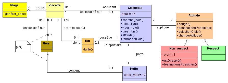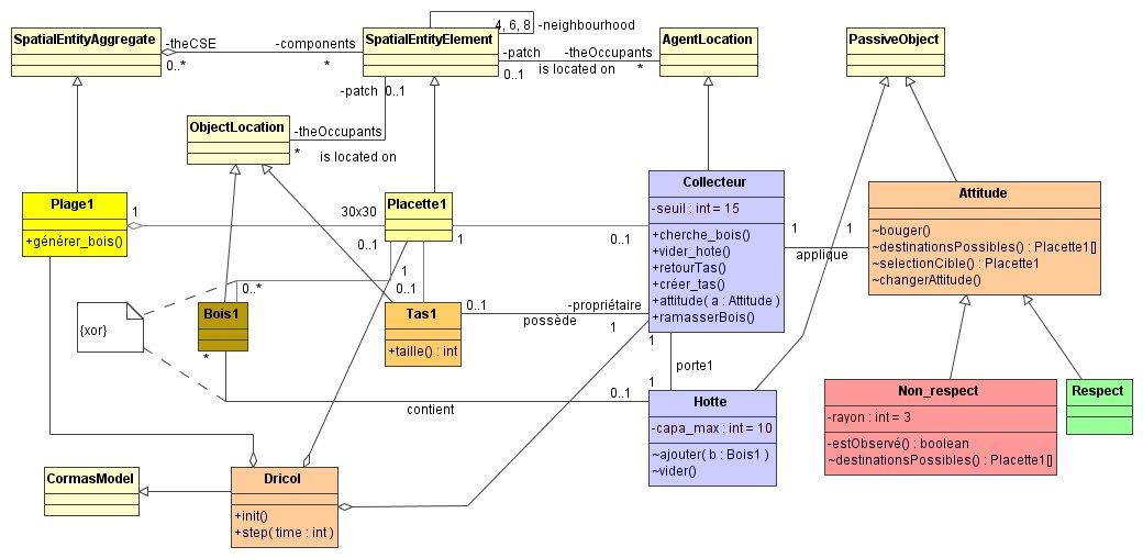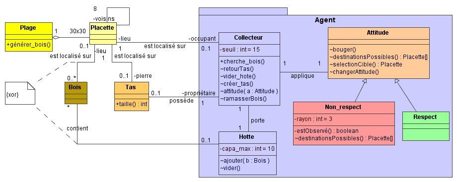 Dans un article intitulé "Spontaneous order", Sugden (1989) analyse comment des règles collectives d'accès à une ressource naturelle peuvent évoluer et se maintenir sans effort collectif explicite ou sans intervention extérieure. D'après Sugden, le problème des règles d'accès se rapproche d'un jeu de coordination. Comme dans le cas de la théorie des jeux, il est difficile de prévoir l'évolution du système car le comportement des agents n'est pas seulement guidé par la rationalité économique. Comme exemple, il cite le cas de conventions de partage de ressources sur une côte du Yorkshire en Angleterre. Sur cette côte, les habitants collectent le bois apporté par les marées. Une des conventions de collecte a retenu notre attention : lorsqu'une personne ramasse du bois, elle constitue un tas dont elle marque la propriété par un pierre. Cette convention peut être examinée d'un point de vue économique : comme elle permet d'éviter une perte de temps à surveiller le bois, elle augmente l'efficacité de la collecte par rapport à une situation de libre accès. La question est de savoir comment cette convention est apparue. Sugden s'intéresse à son apparition sans faire appel à l'hypothèse d'un agent extérieur, capable d'imposer une règle. Les questions induites sont les suivantes : comment une convention change-t-elle ? (c'est à dire : comment une majorité de gens se met-elle à suivre une nouvelle règle ?) Quels sont les processus qui permettent à la règle de s'auto-renforcer et qui conduisent à son adoption collective ? Sugden étudie différents éléments qui peuvent aider à répondre à ces questions. A partir de cet article, nous avons développé un modèle multi-agents, à l'aide de la plate-forme Cormas. La grille spatiale représente une plage où sont situés des morceaux de bois. Des agents observent leur environnement, se déplacent, collectent le bois et le rassemblent en tas. Dans un premier modèle simple, il n'y a pas de règles de respect des tas de bois. Les agents parcourent la grille, ramassent du bois sur la plage et constituent des tas que les autres viennent piller. Le modèle peut être utilisé pour analyser l'émergence d'une règle collective. Deux hypothèses ont conduit à des simulations. La première est appelée la "pression des pairs". Lorsqu'un agent a dépassé un seuil de bois entassé, il devient respectueux de la propriété. Il va non seulement respecter les tas des autres agents mais aussi imposer ce respect : si un agent se trouve dans son rayon de visibilité, il l'empêche de piller les tas. Si le tas d'un agent respectueux est pillé et passe en dessous du seuil, il redeviendra irrespectueux. Dans ce cas, un équilibre est trouvé lorsque tous les agents sont respectueux de la propriété. Le délai dépend évidemment du seuil, de la quantité de bois et du nombre d'agents. L'autre hypothèse est l'imitation. Au début de la simulation, les individus sont aléatoirement respectueux ou non de la propriété. Si un individu respectueux de la propriété se trouve entouré d'une majorité de non-respectueux (dans son rayon de visibilité), il va changer son comportement, et vice-versa. Dans ce cas, on note une grande instabilité du nombre d'agents respectueux. Ce chiffre oscille largement pendant toute la simulation jusqu'à ce que l'un des deux comportements l'emporte. La disposition initiale des tas a une grande influence : si les tas sont rapprochés, les agents seront plus souvent proches les uns des autres et les changements de comportements seront plus fréquents. Ce travail a permis de mettre en évidence l'intérêt des SMA pour traiter des problèmes d'émergence de conventions, qui sont difficilement abordables avec des modélisations économiques classiques. En particulier, les SMA permettent de faire interagir des agents hétérogènes et d'observer l'évolution individuelle ou collective. Représentation UMLCe modèle a été repris et designé en UML lors d'une session de formation. Voici les résultats: Diagramme de classe (phase d'analyse), cliquer pour