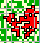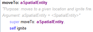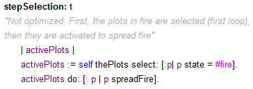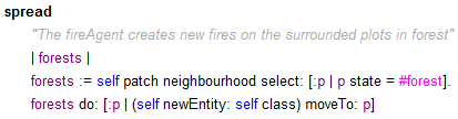 Une entité fireAggregate (avec son contour)A noter que l'affichage du contour des agrégats ralenti la simulation. Sans cet affichage (pov -> FireAggregate -> #nil), les simulations sont aussi rapides que dans la version 2. Version 4 : des entités Feu se déplacent** Sélectionner Fire_4_FireEntity.pcl du modèle Demo_Fire **Dans cette version, des entités Feu (FireEntity) sont créées. Ce sont les seules entités activées par l'ordonnanceur. Considérées comme des agents actifs, ces entités se propagent en créant de nouvelles entités feu sur les cellules voisines : ![]() La méthode #moveTo: a été redéfinie afin d'activer l'ignition des cellules lors d'un déplacement : ![]() Version 4b : des entités Feu se consument et s'éteignent** Sélectionner Fire_5_FireEntityAging.pcl du modèle Demo_Fire **