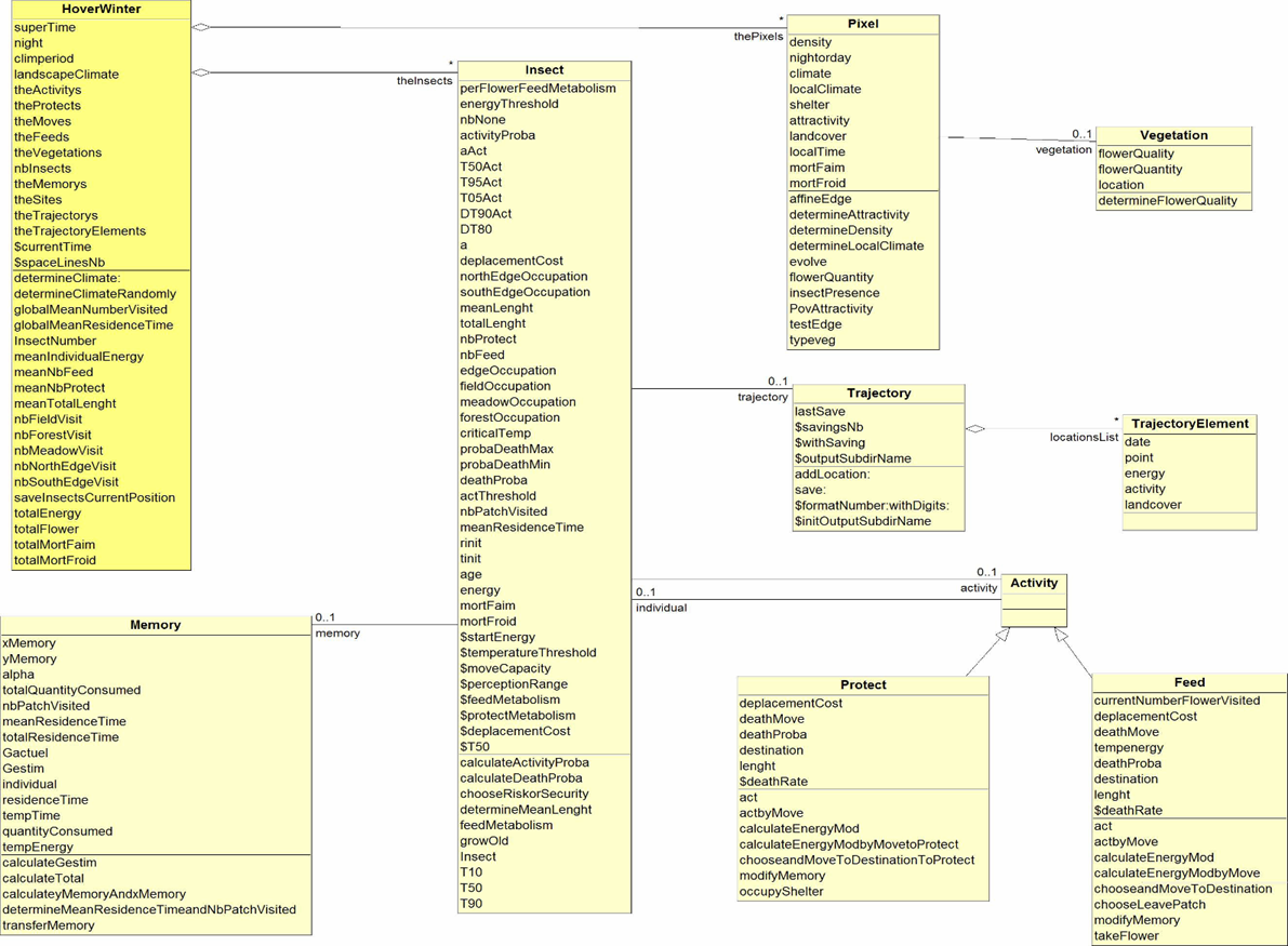 Dans le modèle HOVER-WINTER, dont le nom dérive des termes anglais "Hoverfly" (syrphe) et "Overwinter" (hiverner), chaque insecte est un agent autonome (classe Insect) qui possède un ensemble de règles pour prospecter dans le paysage, se nourrir en fleurs, s’abriter dans les lisières forestières et mourir. Chaque individu est localisé, et se trouve à chaque instant dans une des deux activités suivantes : se nourrir (classe Feed) ou se protéger (classe Protect) (voir diagramme de classes).
