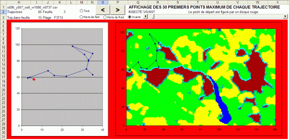 A l’aide du module trajectoire, nous pouvons explorer les possibilités d’analyses spatiales des trajectoires individuelles des insectes pour les relier au modèle mathématique de prospection optimale.