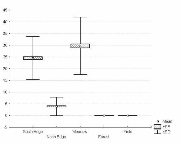 (la figure ci-contre montre le taux de visite moyen par individu des différents types d’occupation du sol durant un hiver. La plupart des individus survivants ont visité préférentiellement les lisières sud et les prairies).
