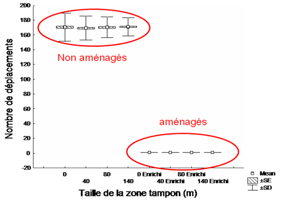 L'intérêt de certains types d’aménagement potentiel du paysage a été analysé par l’étude de scénarios (bandes fleuries à plus ou moins grande distance des lisières), montrant un effet à la fois sur le taux de survie (nette augmentation) mais aussi sur le comportement des individus (cf. figure ci-dessous).