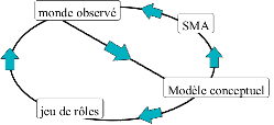 Certains modèles développés à l'aide de Cormas ou de SMA sont utilisés comme jeux de rôles. Le passage du modèle au jeu de rôles est rendu possible par un certaine analogie entre les agents du modèle et les acteurs du jeu, entre les règles du modèle et les rôles du jeu, entre la simulation et la session de jeu. Les travaux entrepris sur ce sujet ont en commun de proposer un passage dans les deux sens entre le modèle et le jeu. Les deux outils se complètent et s'enrichissent mutuellement. Lorsque les acteurs intervenant dans la gestion d'un espace ou d'une ressource jouent au jeu de rôles ou manipulent le modèle, ils apportent des modifications au modèle. Pour bâtir les modèles, les démarches comprennent généralement un diagnostic, une formalisation et une validation. Ensuite, les modèles sont utilisés en tant que système multi-agent ou en tant que jeu de rôles, pour la formation ou la négociation. A l'issue de la première utilisation, les modèles sont modifiés en fonction du comportement des acteurs réels face au jeu (voir figure suivante).