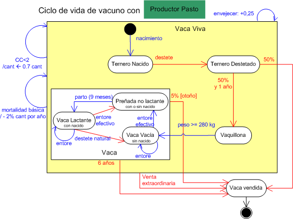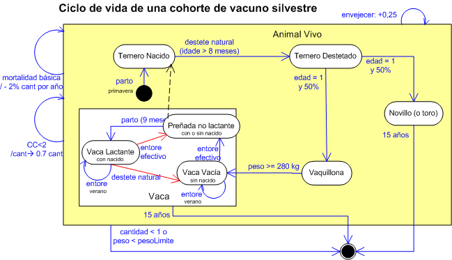 El diagrama de estado-transición seguinte mostra el ciclo de vida de una cohorte de vacuno silvestre con sus sub-estados.