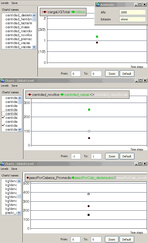 Algunos resultadosLa simulación seguinte mostra la evolución del clima, del pasto y del rodeo de vacuno: